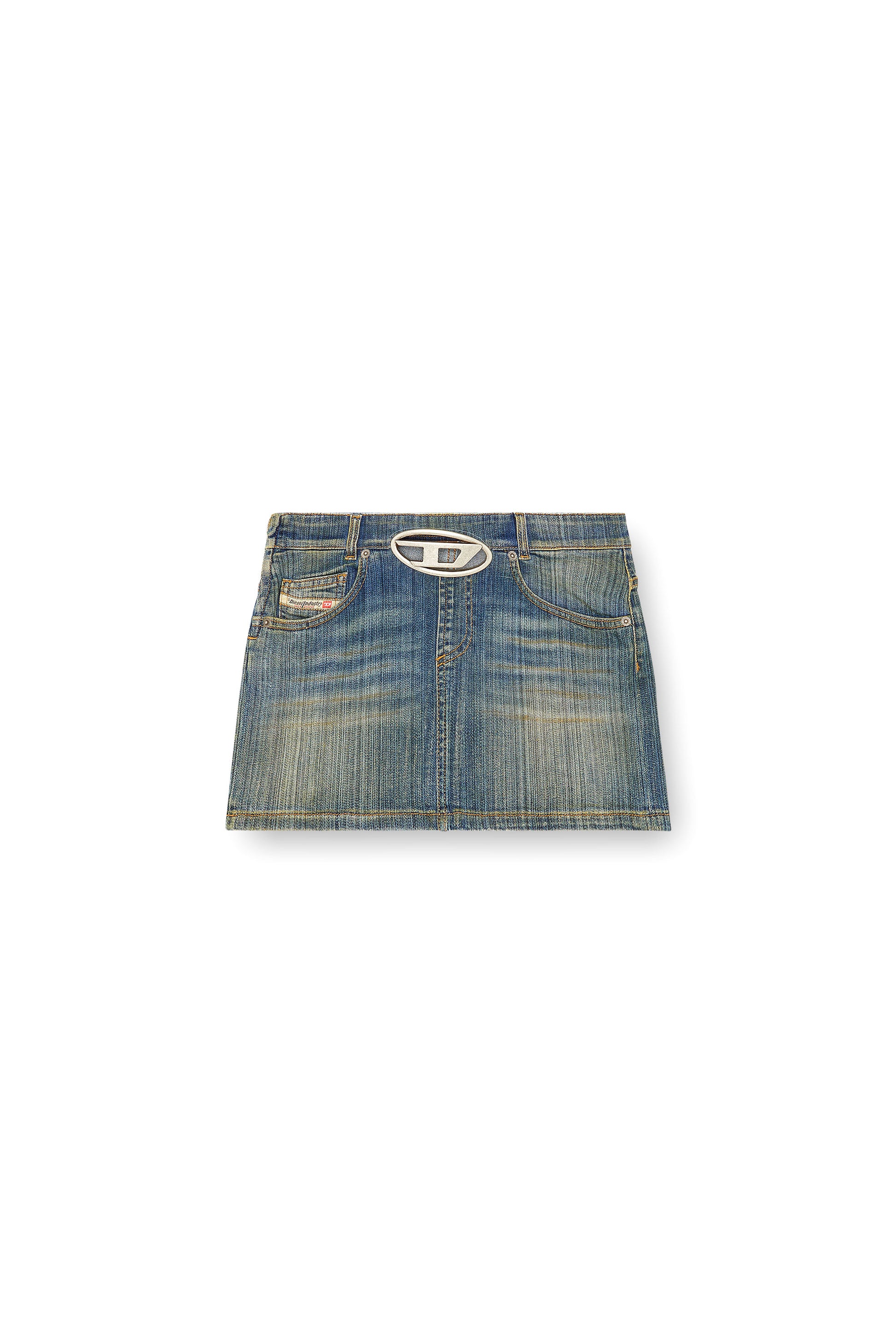 This short denim skirt features a low waist, enriched with an inlaid and cut-out Oval D metal buckle. Finished with the iconic fifth pocket flag.