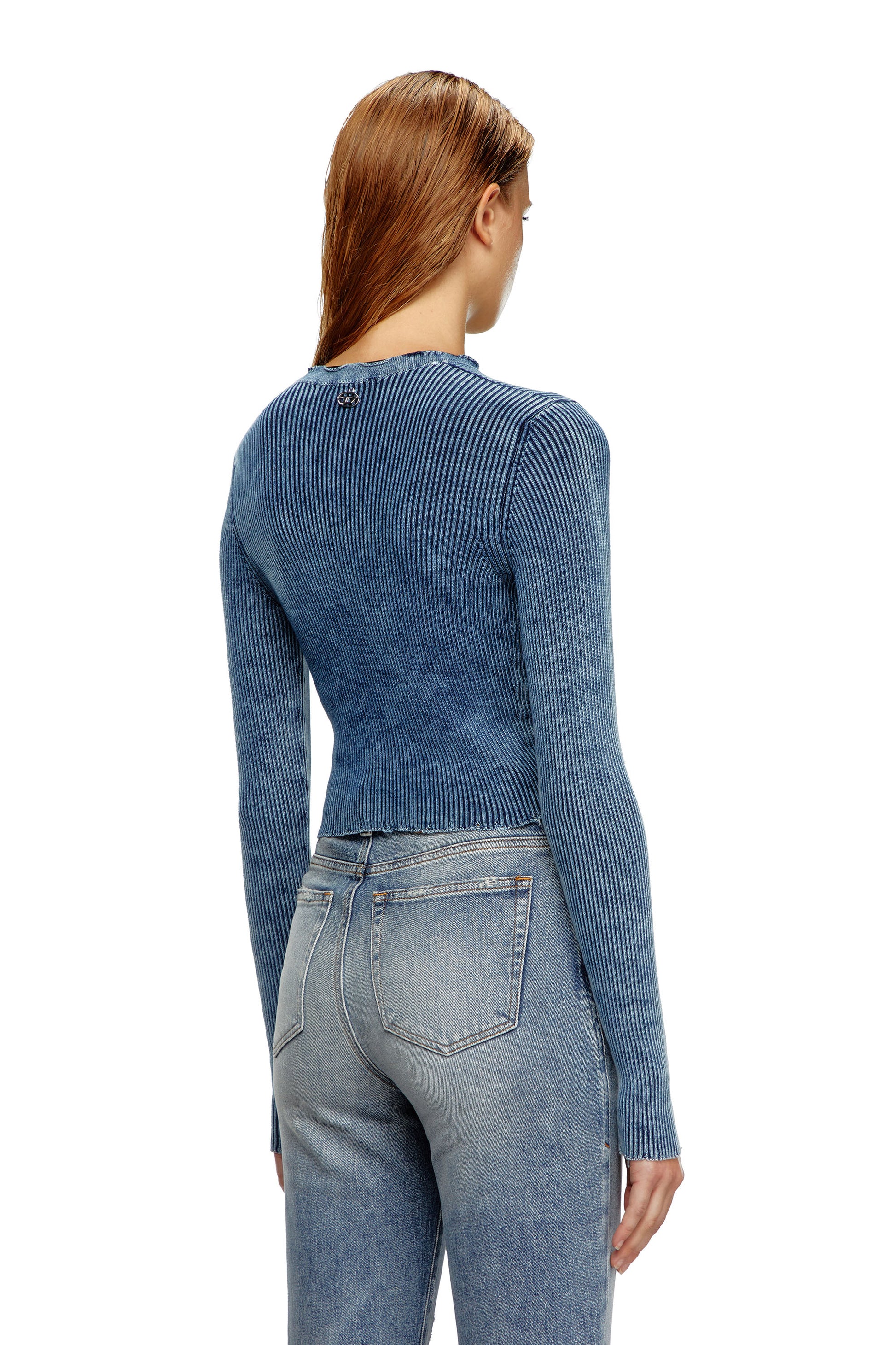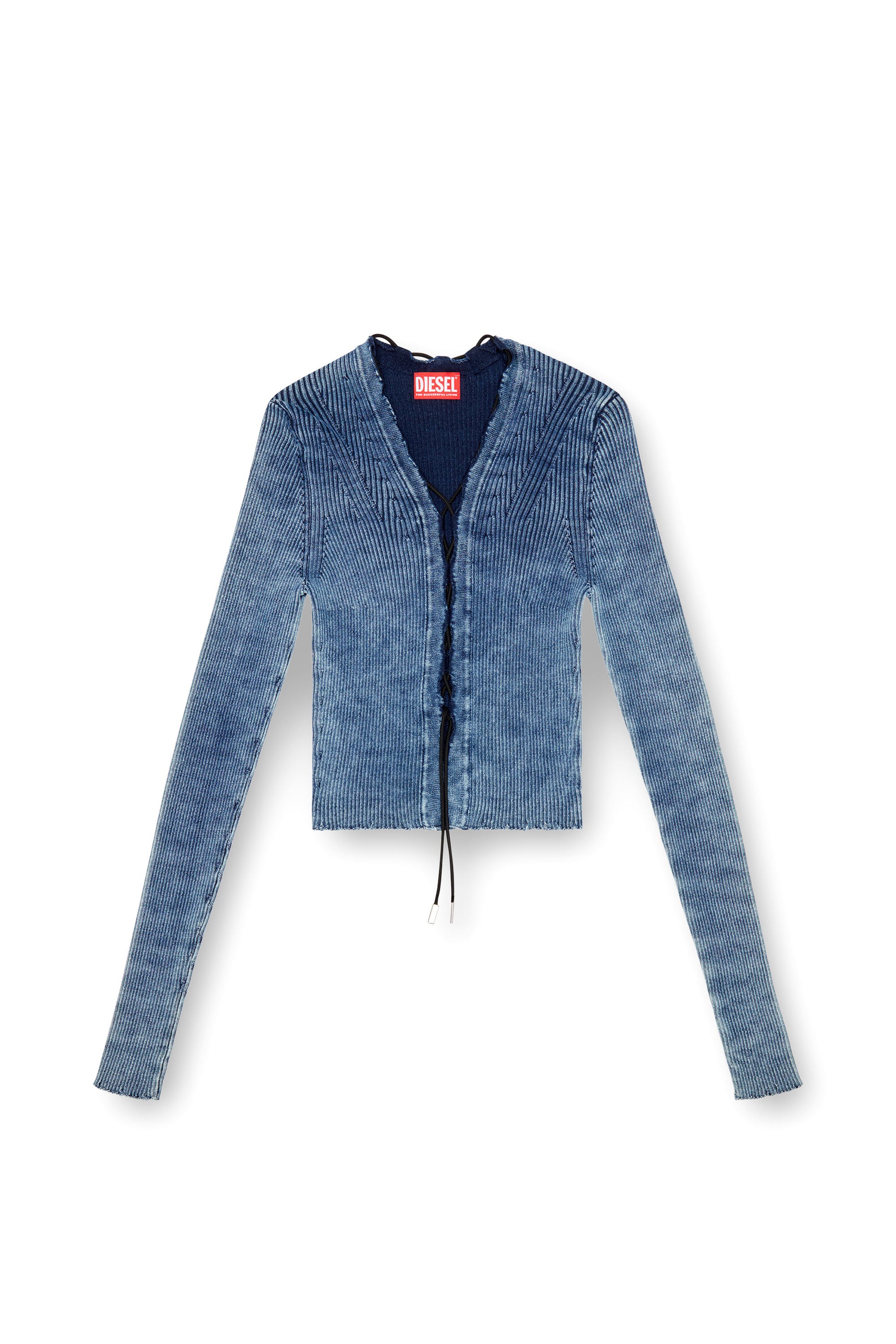 This women’s ribbed top is a treated indigo knit that resembles denim – Diesel’s DNA fabric. Spun with organic cotton, it has a close fit and a slightly cropped length. Loosen the laced ties to reveal more skin and create a plunging neckline.